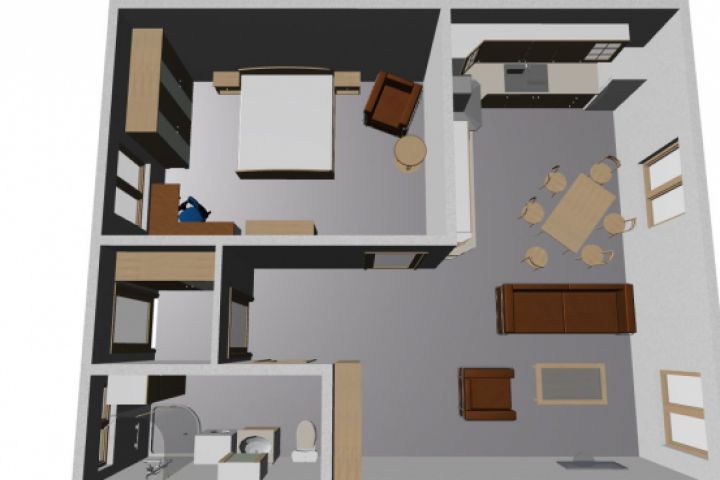3d вид (НЕ визуализация) планировки дома с расстановкой мебели. Необходим на начальных стадиях разработки дизайн-проекта для понимания расположения мебели и оборудования.