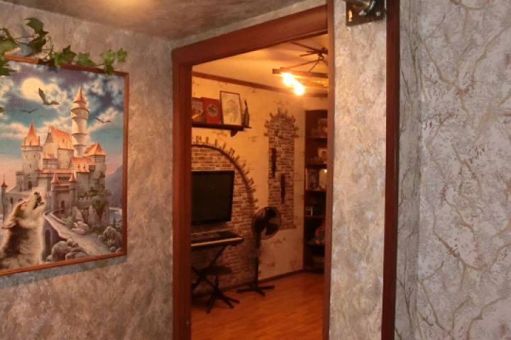 Вид на нишу, предваряющую вход в детскую комнату, освещение этого участка так же контролируется из самой комнаты. В проходе по желанию заказчика оставлена металлическая балка, позволяющая использовать проход между помещениями как спортивный тренировочный турник.