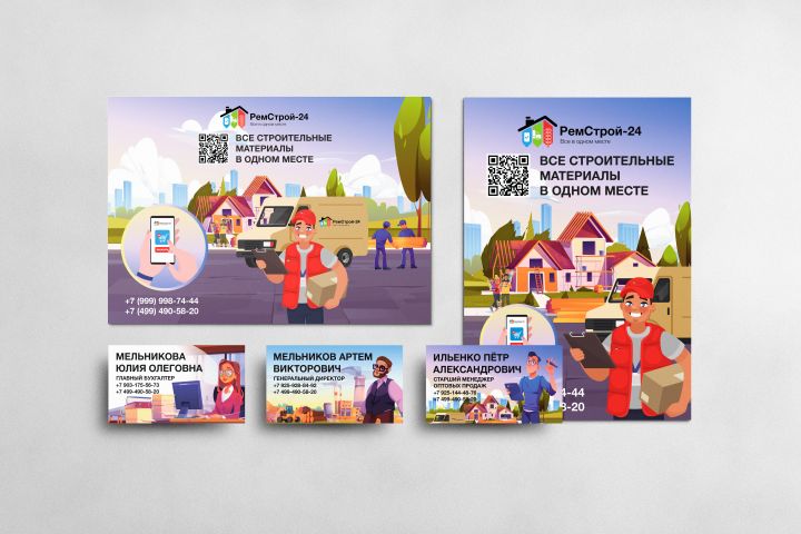 Дизайн брошюр и визиток выполнен в векторной графике с использованием ярких и красочных иллюстраций, а также персонажей, которые символизируют различные аспекты строительных и ремонтных работ. В проекте использованы как стоковые иллюстрации, так и авторские элементы, разработанные специально для данного проекта.