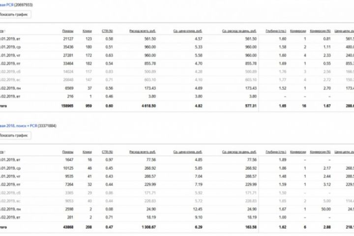В период аудита было просмотрено более 10 предыдущих кампаний, работающих больше года. Выявлены ошибки настройки и большое количество «нерабочих» ключевых слов.