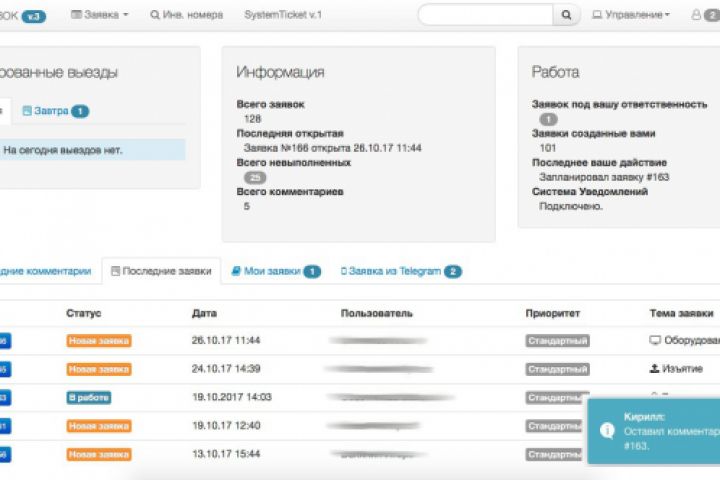- Подключаемый БОТ Telegram. Регистрация сотрудника у бота. Уведомление подключенных пользователей о новых заявках. Создание новой заявки через бота.