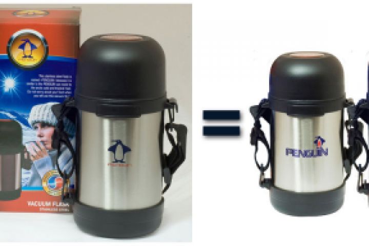 Новая развёртка для коробки + фото термоса со старым логотипом на фоне старой коробки + новый логотип = композиция из новой свёрнутой коробкит и двух термосов разного объёма с новым логотипом.