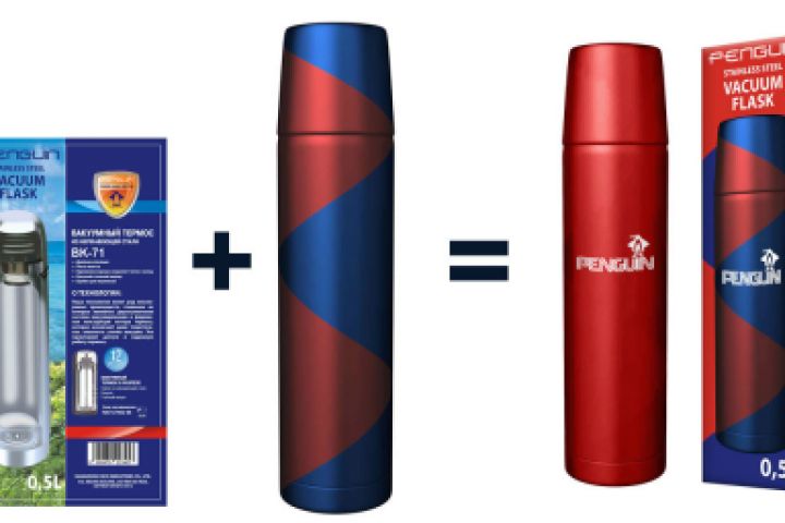 Развёртка для коробки + изображение термоса два в одном = композиция из собранной коробки и двух термосов, каждый в своём цвете и с логотипом.