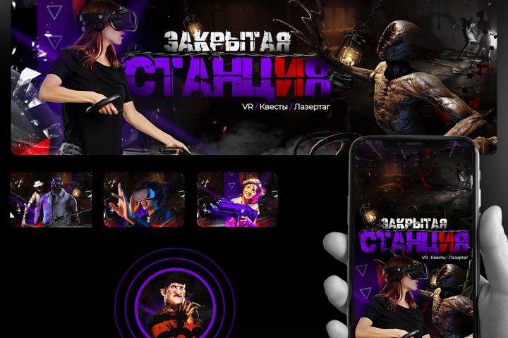 Дизайн группы по квестам в реальности, лазертагу и кибертагу в Тольятти от Закрытой станции. Пожелания заказчика: "Сочетание красочного и темного фона, хотим выделяться на фоне конкурентов по региону. Что именно разместить не придумала, но должна отражаться деятельность: может быть человек в vr очках, с автоматом из лазертага или квест комната."
