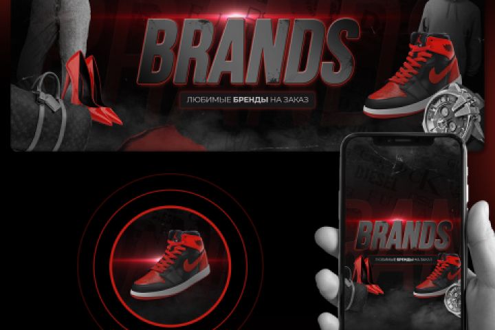 Яркая и стильная упаковка группы по продаже брендовой обуви, вещей и аксессуаров. Беспроигрышное сочетание темного и красного сразу привлекает внимание потенциального клиента, увеличивая шансы на успешную сделку.