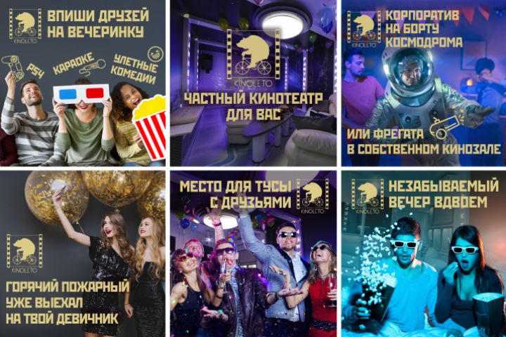 Разработка креативов (дизайн, тексты) для частного кинотеатра в Москве.