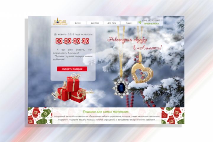 Лэндинг для ювелирного магазина с ярким новогодним дизайном. Цель - привлечь покупателей и рассказать о новогодних акциях и бонусах. На главном экране счетчик, рассказывающий о том что до нового года мало времени и надо бы уже подарки купить,а они у них как раз есть)
