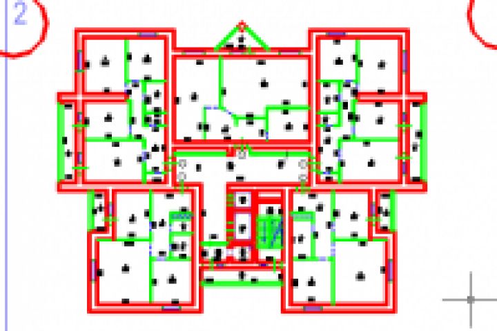 План дома (этажа) в AutoCad. Техническая документация БТИ. Для наглядности представлен с разделением цвета в слоях и весом линий.