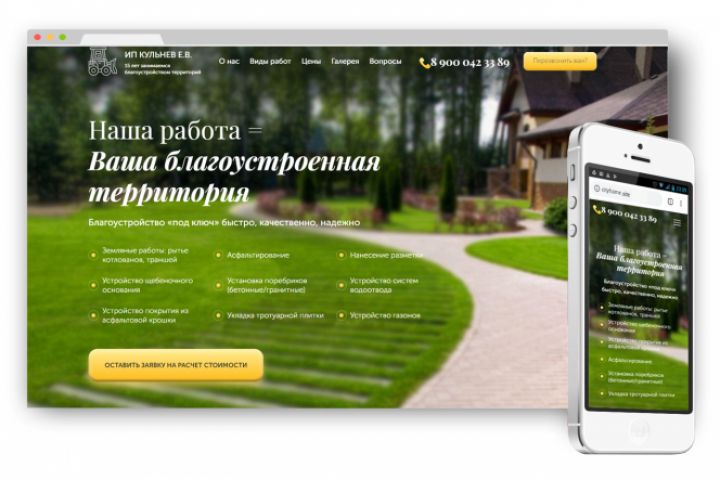 Разработали текстовый прототип, создали логотип и создали дизайн лендинга на 6 блоков по благоустройству. Маркетологом был написан продающий текст. Перенесли на хостинг клиента.