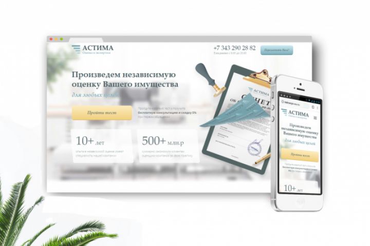 Разработали текст и дизайн, а далее сверстали лендинг для компании ООО Астима по оценке движимого и недвижимого имущества.