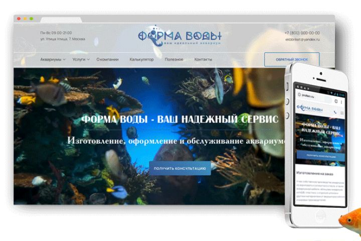 Разработка корпоративного сайта для компании Форма воды. Написание текста для всех услуг, изготовление видеозаставки на главной странице. Разработка тематических страниц и калькуляторов расчета для изготовления аквариума.