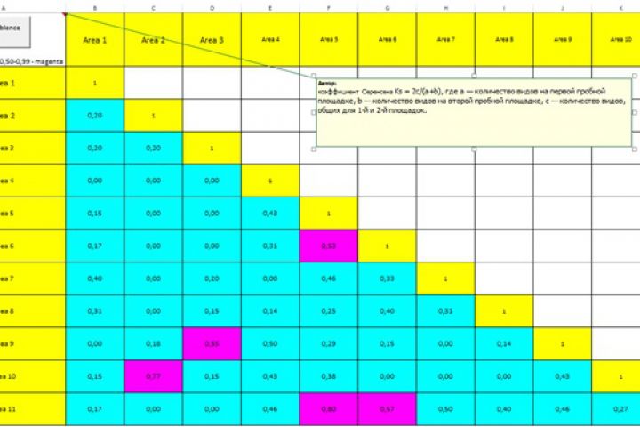 Исходные данные столбцов считываются последовательно и попарно друг с другом, создавая массивы для расчета коэффициентов флористического сходства Съеренсена. Рассчитанные коэффициенты Съеренсена размещаются на пересечении строк и столбцов под главной диагональю матрицы, формируя