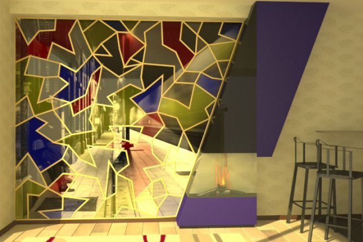Проект малогабаритной спальни в нежном сиреневом цвете. Разделение со смежной комнатой выполнено с помощью стеклянной перегородки, что удобно в современных однокомнатных квартирах, позволяя отделить любую часть помещения, не теряя попадание прямого солнечного цвета.