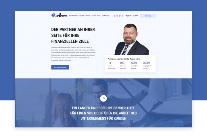 Для страховой, финансовой компании из Германии, - была создана личная посадочная страница для каждого сотрудника компании. При создании маркетинговой части дизайна, были проанализированы и использованы лучшие практики из интерфейсов конкурентов и смежных направлений. Стилистика взята с основного сайта.