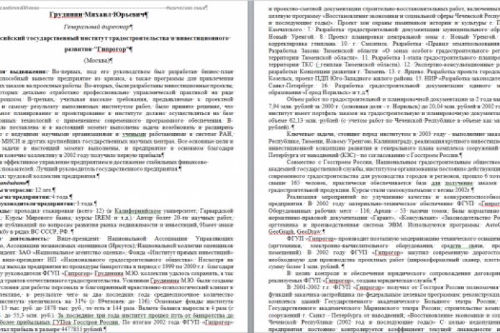 Основания для выдвижения: Во-первых, под его руководством был разработан бизнес-план предприятия, способный вывести предприятие из кризиса, а также программы для привлечения дополнительных заказов на проектные работы. Во-вторых, были разработаны инвестиционные проекты, содержание которых детально отработано профессионально управленческой практикой на ряде объектов в прошлом. В-третьих, учитывая высокие требования, предъявляемые к проектной документации и самому результату выполняемых институтом работ, было принято решение, что градостроительное планирование и проектирование в институте должно осуществляться на базе геоинформационных технологий с применением современного программного обеспечения. В-четвертых, была поставлена и в настоящий момент выполнена задача возобновить и расширить сотрудничество с ведущими научными организациями и учеными работающими в системе РАН, РААСН, МГУ, МИСИ и других крупнейших государственных научных центрах. Все основные цели и поставленные задачи в настоящий момент выполнены, и предприятие в основном благодаря руководителю и конечно коллективу в 2002 году получило первую прибыль