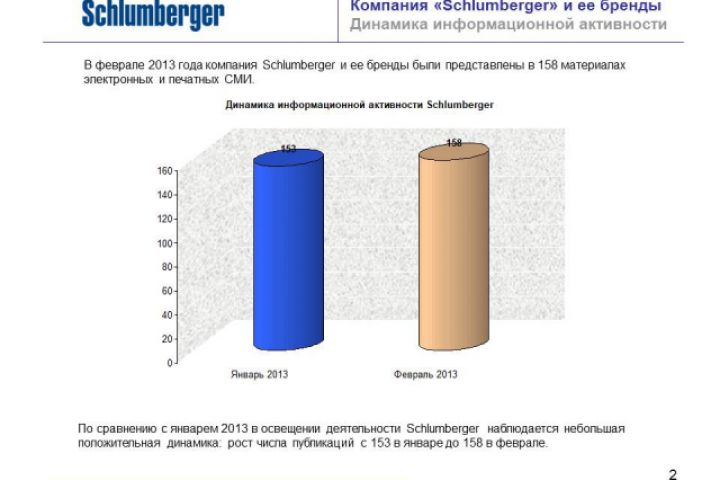 Итоги отчета В феврале 2013 года Schlumberger был представлен в 158 публикациях электронных и печатных СМИ. По