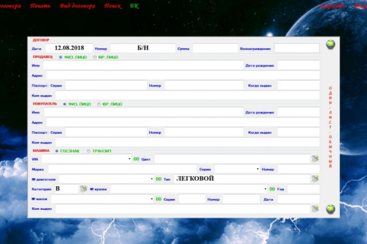 Программа создает, редактирует и сохраняет договора купли / продажи автотранспортных средств.