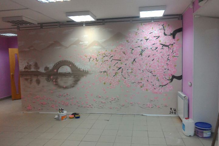 Роспись водоимульсионой краской в кафе японской кухни. Росписи - 2 года. Краска не выцвела и не осыпалась. Время выполнения работы - 1 день.