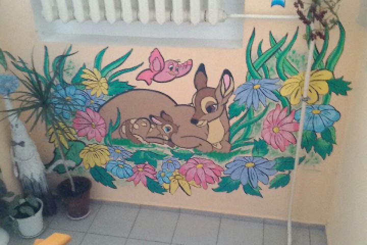 Роспись подъезда водоимульсионой краской. Росписи 7 лет, не выцвела и не осыпалась.