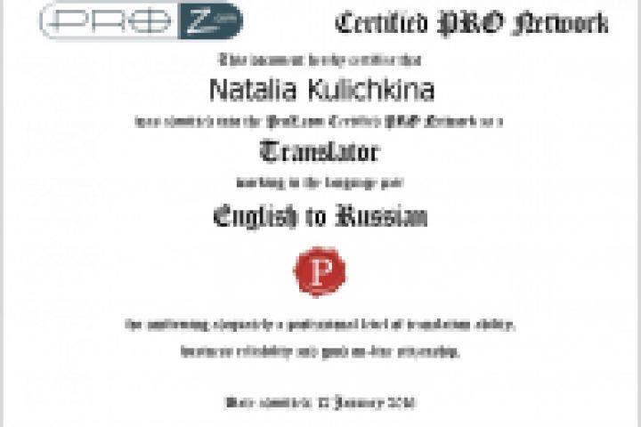 Сертификат члена сообщества 'Certified PRO Network' на одном из ведущих международных переводческих сайтов, подтверждающий профессиональный уровень навыков перевода и хорошую деловую репутацию.
