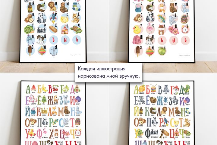 Разработка детского алфавита.4 разных варианта. Каждые иллюстрации были нарисованы мной вручную акварелью и обработаны на компьютере.