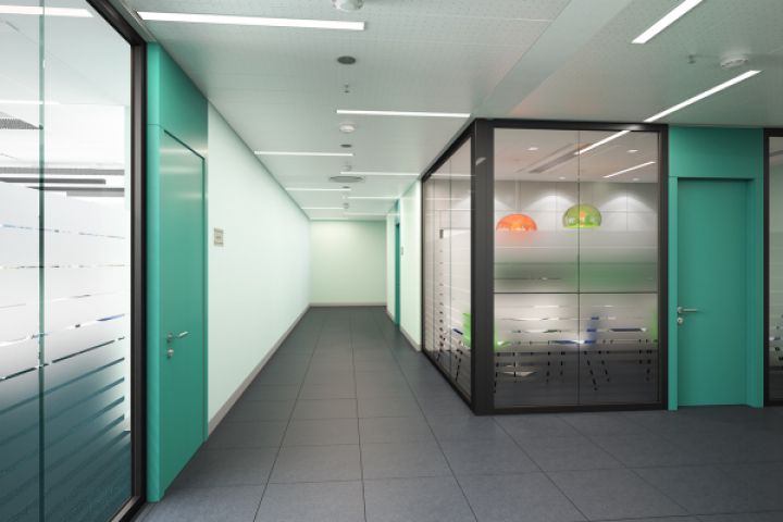 Визуализация концепции оформления коридора в офисном здании.