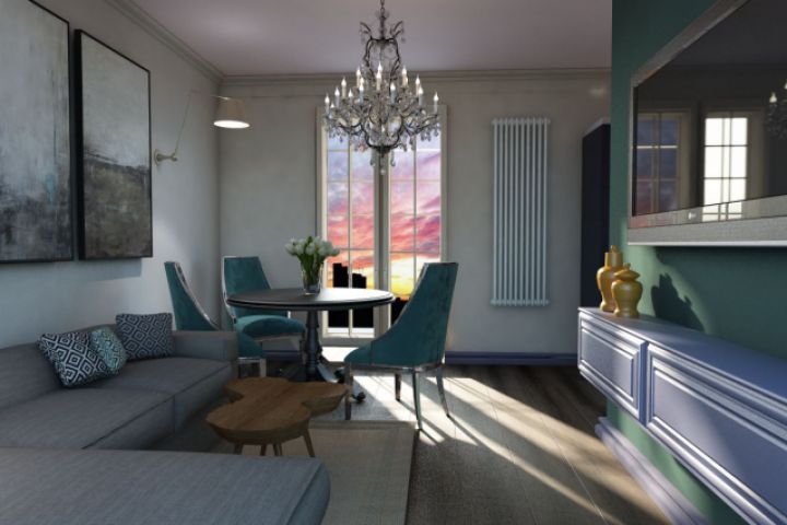 Интерьер гостиной-кухни для квартиры на Московском проспекте. Сочетание классического дизайна с элементами лофта. Площадь: 24 кв.м. 3 рендера, 1 план помещения.