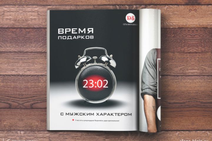 Задача: Разработать к празднику «23 февраля» поздравительный брендовый рекламный модуль. Рекламный модуль должен сообщить читателям, что скоро мужской праздник и в сети «К&Б», уже готовы подарки, для приобретения.