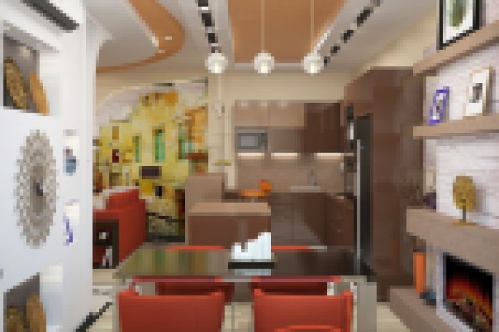 На первом этаже расположилась свободная гостиная переходящая в кухню, которые делит на две зоны барная стойка и островок кухонного гарнитура. В дополнении к кухне есть обеденная зона украшенная декоративным камином. Цветовая гамма в основном теплые оттенки песочного цвета и контрастные яркие вставки на потолке и в мебели -оранжевые и коричневые.