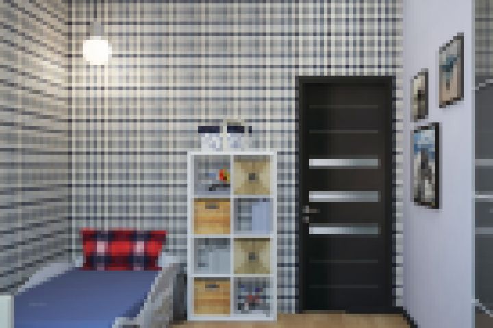 Комната мальчика была продумана для активного времяпровождения, учебы и отдыха. В декоре стен я использовала оттенки синего и красивую клетку в обоях.