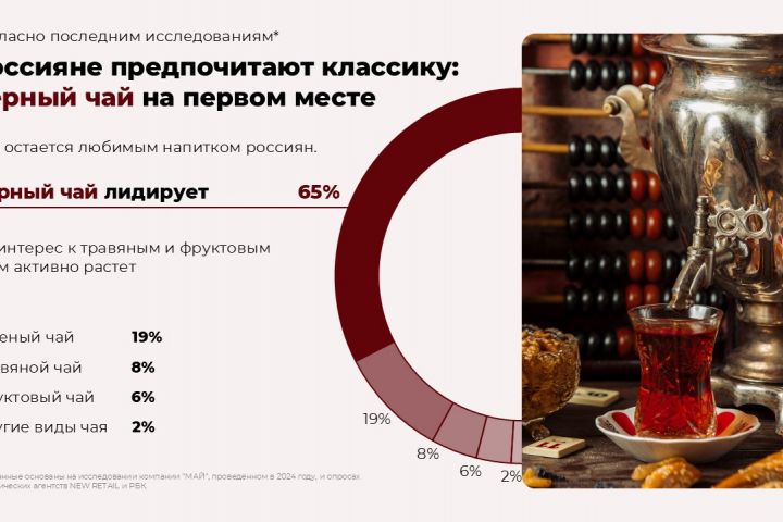 Создать информативный и визуально привлекательный слайд на основе исследования о том, какие виды чая предпочитают россияне.