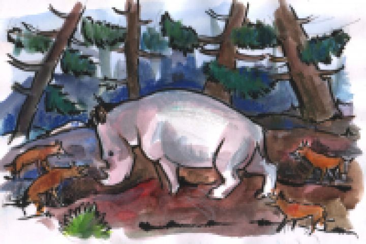 Но он скоро рог оставит: Друг его в лесистом мраке, Где его упорно травят Быстроногие собаки.