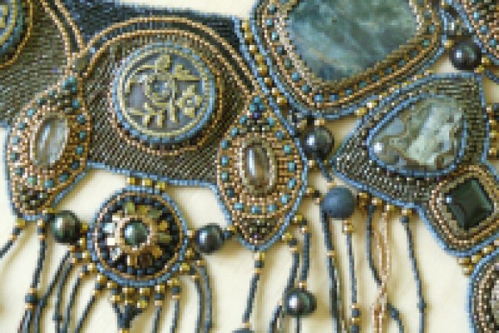 бисер Toho, лабродор, пирит, аммонит, черный стеклянный кабошон, кабошоны кварца, четыре антикварных викторианских пуговицы, бусины черного жемчуга и вулканической лавы, фурнитура. Подложка - овечья замша наппа.