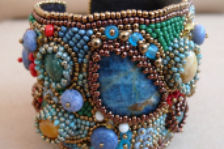 Бисер Toho и Miyuki, два синих бразильских апатита, два симбирцита, бусина окаменелого коралла и бусины синего коралла, маленький малахит, два маленьких зеленых авантюрина и, кажется, два маленьких зеленых нефрита.