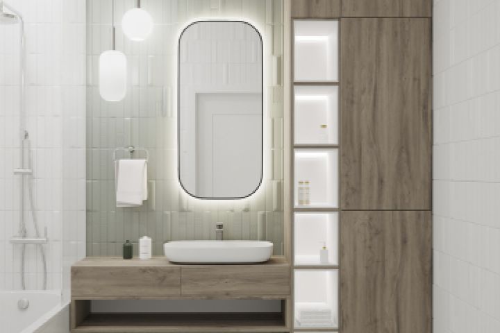 Для визуального разделения пространства использованы полки для хранения средств гигиены, что помогает поддерживать порядок и добавляет элемент дизайна. Зеркала также использованы для визуального расширения пространства и улучшения освещения.