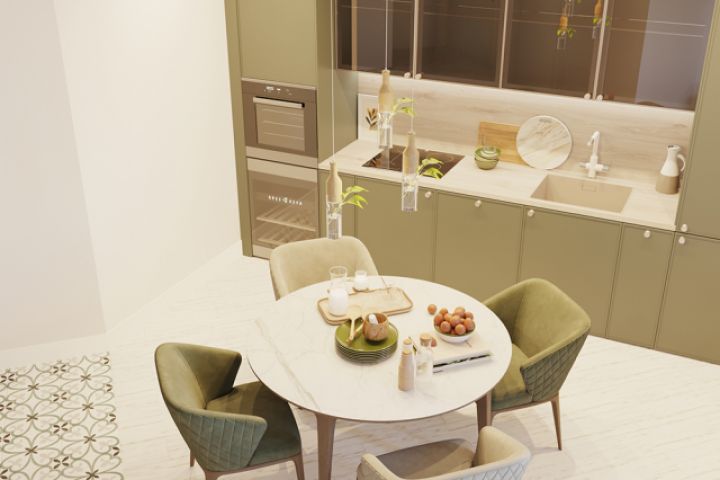 Кухня-гостиная превратилась в светлое и уютное пространство, где каждый элемент гармонично сочетается с другим. Зелёные акценты добавляют в интерьер нотку природы, создавая атмосферу спокойствия и гармонии. Функциональная организация пространства позволяет комфортно разместить всех членов семьи, а также гостей. Интерьер сочетает в себе эстетику и практичность, что делает его идеальным для повседневной жизни.
