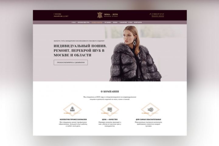 Дизайн посадочной страницы для мехового ателье. Страница разработана для ключевого направления в работе ателье - пошив шуб на заказ. Ключи в разработке макета: эксклюзивно, элегантно, дорого. Целевая аудитория – женщина, от 30 лет, с достатком выше среднего.