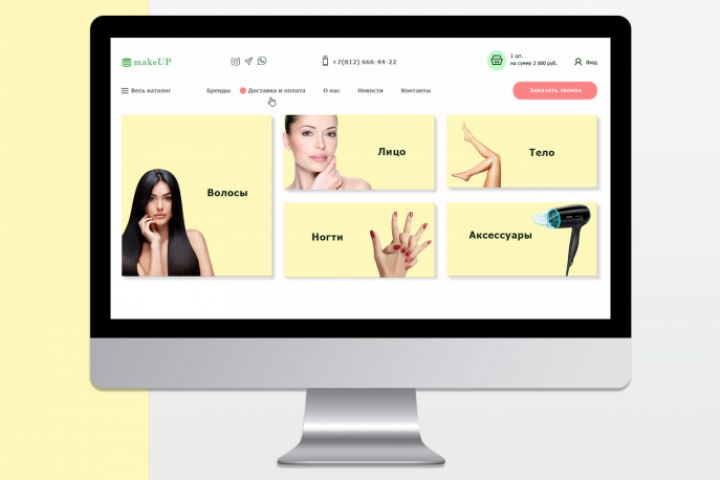 Интернет-магазин MakeUp - магазин косметики ориентирован на женскую аудиторию. В дизайне использованы зеленый, розовый и желтые цвета приятные и не отвлекающие внимание от ассортимента магазина.