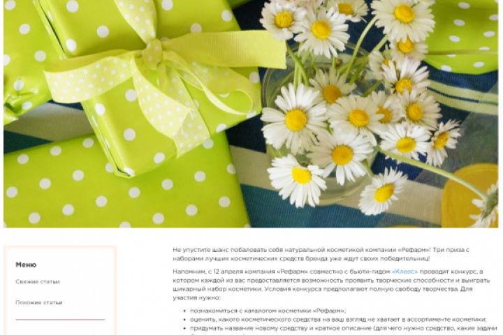 Спешите! Конкурс от «Рефарм» и «Клеос» завершается! Заполнение блога сайта. 100% копирайт. Верстка материала. Размещение на сайте.