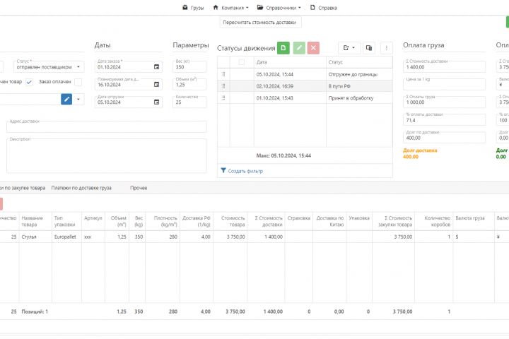 CRM веб-программа с базой данных. Учет поставок товара, рейсов с грузами, учет расчётов. Ролевой доступ для админов и клиентов.