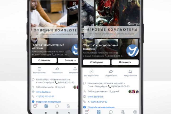 Необходимо разработать несколько слайдеров для мобильной страницы ВК компьютерного магазина "Ультра", который находится в Санкт-Петербурге.