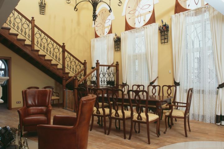 Заказчик делал интерьер в готическом стиле , использовались много кованых изделий и дерева , в гостиной были 3 высоких окна .Окна драпировались по индивидуальному дизайну к этому дому ,стиль которого был ближе к стилю замка . Шторы из натуральной ткани , подхваты и отторочка темные ( что стилизует под готику ) , оформление верхнего проема окна изготавливалось почти вручную .