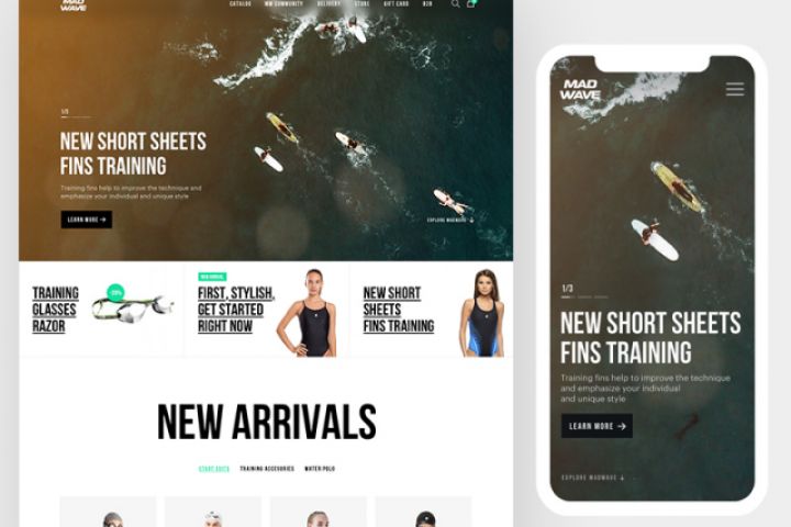 Дизайн главной для магазина Madwave. Madwave — товары для профессиональных пловцов.