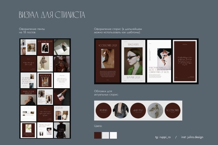 Оформление инстаграма для стилиста • Лента на 18 постов • Создание шаблонов для сторис • Оформление обложек для актуальных • Подбор фото, шрифтов, цвета Июль 2021 года. Сделала Юлия Ро.
