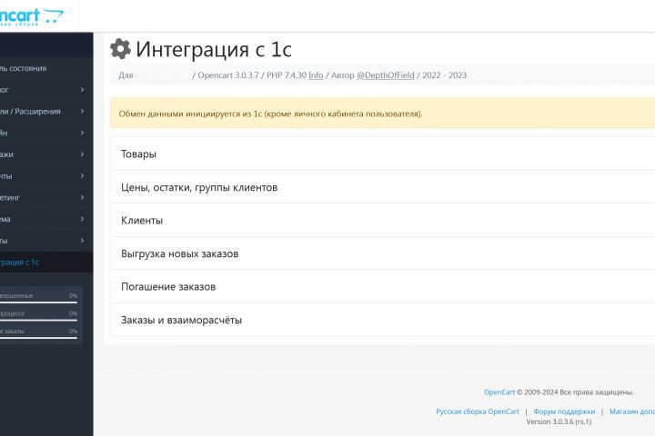 Скрипт осуществляет обмен товарами, клиентами, заказами с 1с. Так же есть интеграция личного кабинета и 1с.