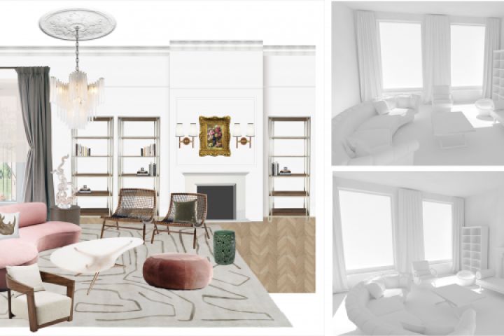 Коллажная подача дизайна гостиной для загородного дома в стиле эклектика