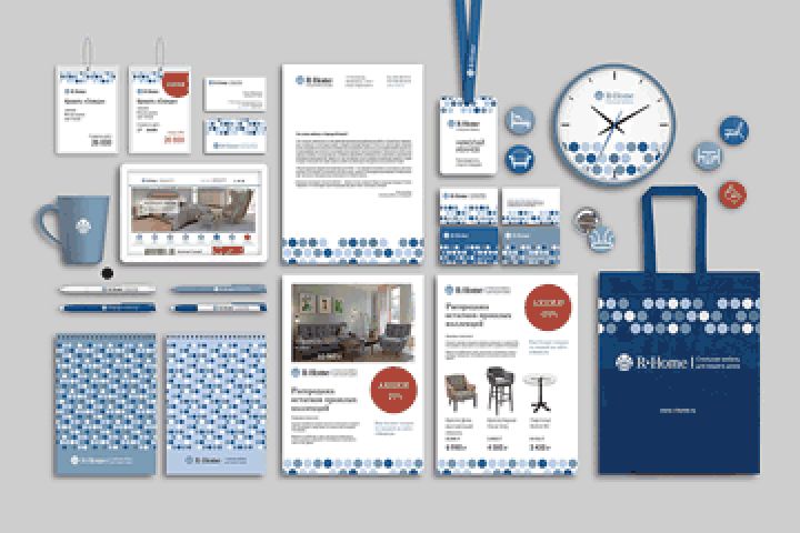 Решение: Фирменный знак R-Home представляет из себя стилизованное изображение мягкой мебели. Разработан паттерн, с помощью которого легко можно брендировать любой корпоративный носитель.
