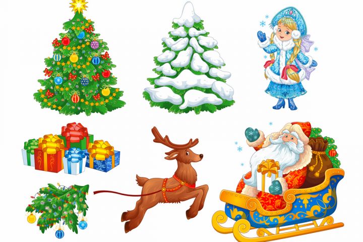 Дед Мороз, Снегурочка и новогодние элементы. Вектор