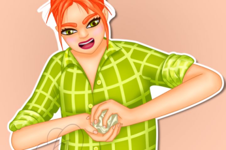 Стикер с девушкой, комкающей бумагу. Бывает у художников такая злость.