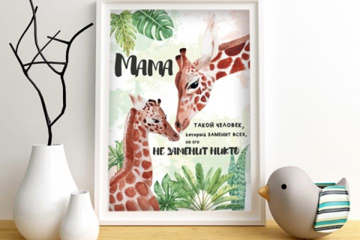 Отрисована иллюстрация с жирафами и подготовлен макет постера для детской комнаты.